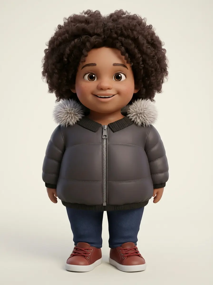 A cartoon rendered boy named Shannon is wearing a black winter jacket, blue trousers and red shoes.