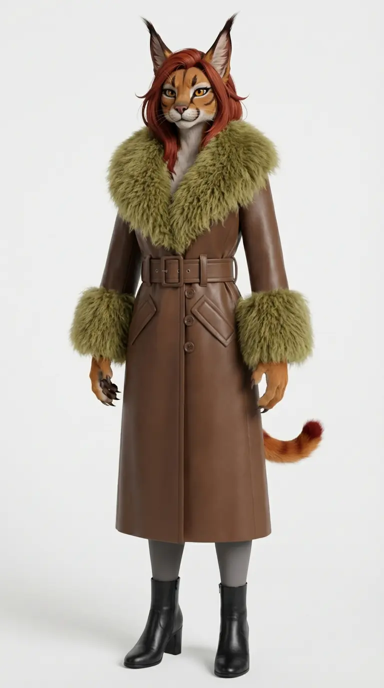 An elegant caracal woman named Sienna. She has reddish-brown dyed hair, rustic-brown fur and eyeliners. She wears a long mocha brown leather Penny Lane coat with khaki green Mongolian fur collar and cuffs, fastened with buttons and a waist belt. She also wears black ankle boots and gray tights. She has clawed hands. Her tail protrudes at the back of her coat.