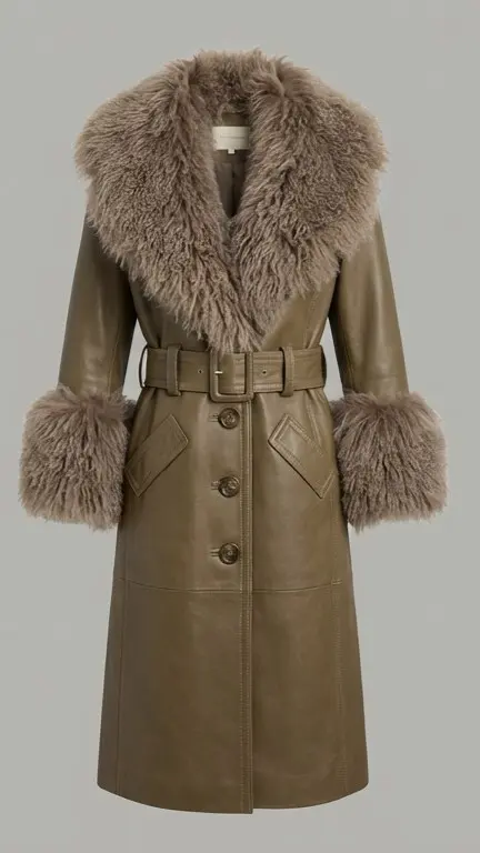 Khaki Brown Leather Coat with Taupe Fur Trim