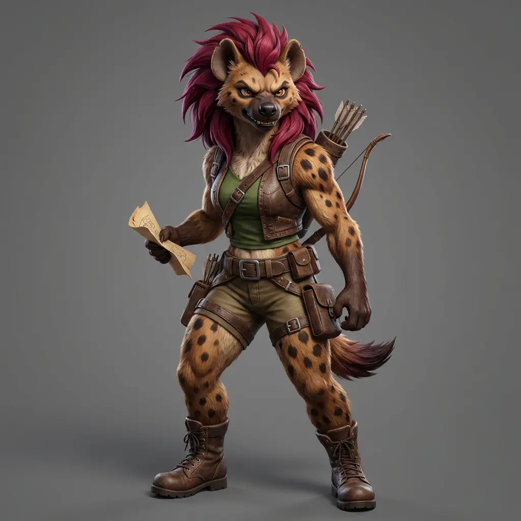 A hyena "Tomb Raider" hybrid character. It features a muscular, bipedal form with spotted tan fur, dark paws, and an aggressive expression framed by a vibrant magenta dyed spiky mane. The character is equipped with a worn brown leather vest, belt with utility pouches, khaki shorts, an olive green crop top, and robust brown combat boots. It clutches a crumpled map, with a recurve bow and quiver of arrows across its back.