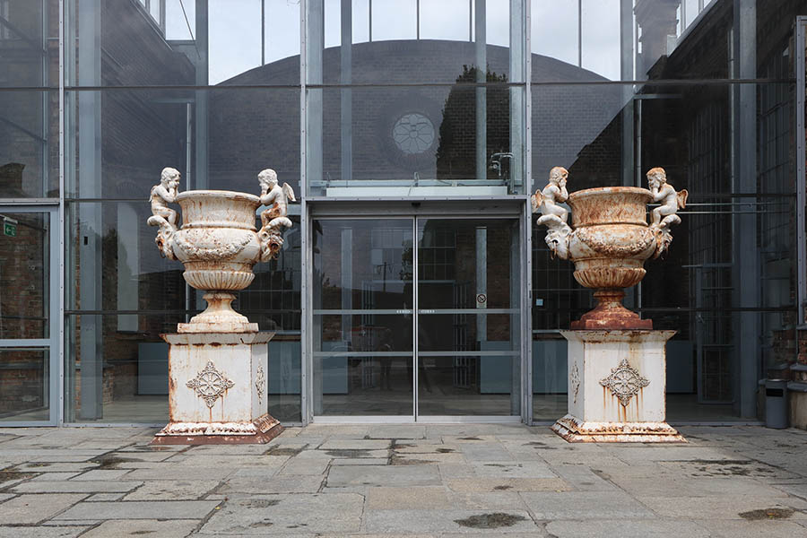 Large ornamental vase on the grounds of METAStadt, a former industrial site in Vienna's 22nd district. The event location on around 14,500 m2 is now used for concerts, events and flea markets. Sculptures on the grounds of METAStadt were provided by the company Antik-Möbel-Hesz.