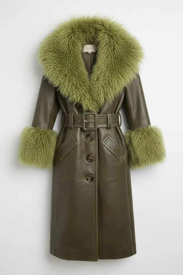 A full-length olive-green leather coat is centered in the frame against a neutral gray background. The coat features a large, fluffy, lime Mongolian fur collar and cuffs. A matching leather belt cinches the waist, with a rectangular buckle. The coat is buttoned up, with visible buttons down the front. The sleeves are long, with the fur cuffs extending past the wrists. Game ready.