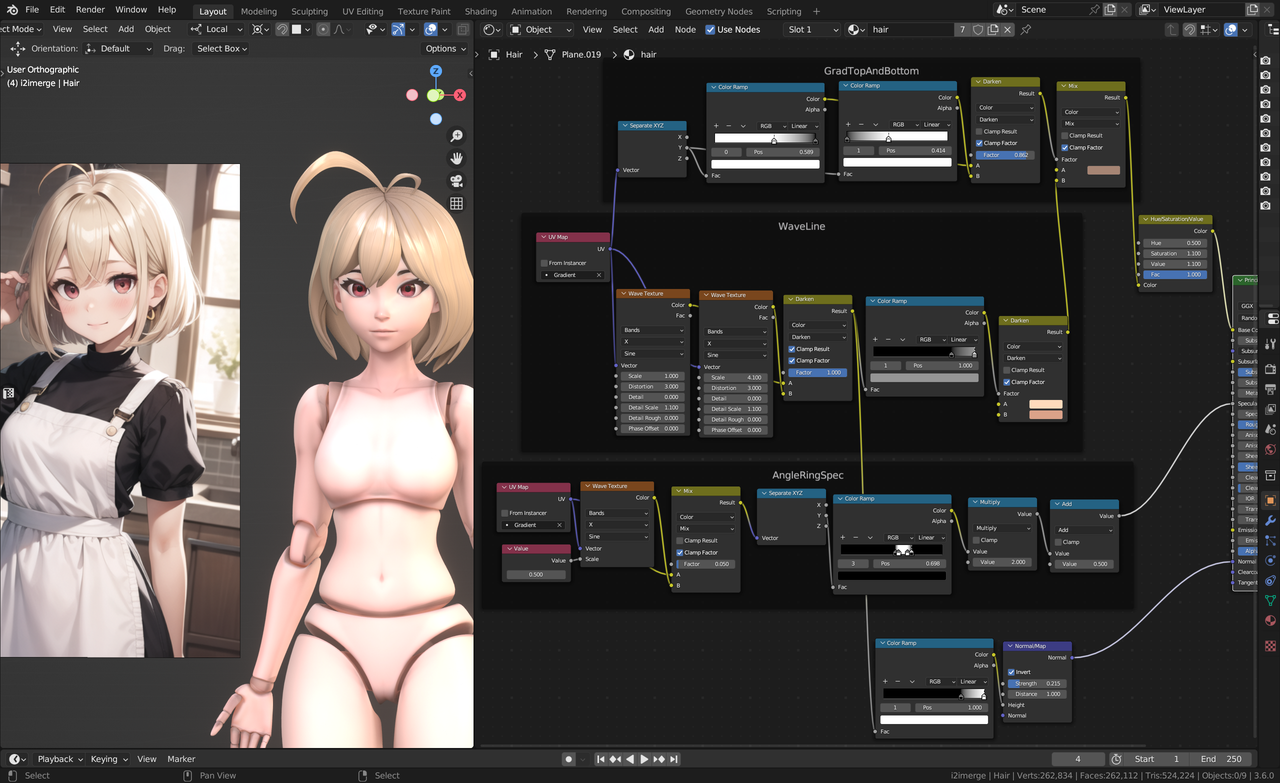 I applied the latest body, switched the AICG texturing hair and eyes to procedural shader, which seems more efficient and pretty. I will go on with clothing and mecha, then level and UI, and think about gameplay/coding and story in the meantime.