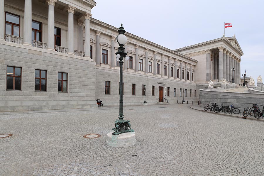 Base of a street lamp in front of the parliament in Vienna's 1st district. Three griffins sit on a stone pedestal, with the column leading to the light source in the middle.